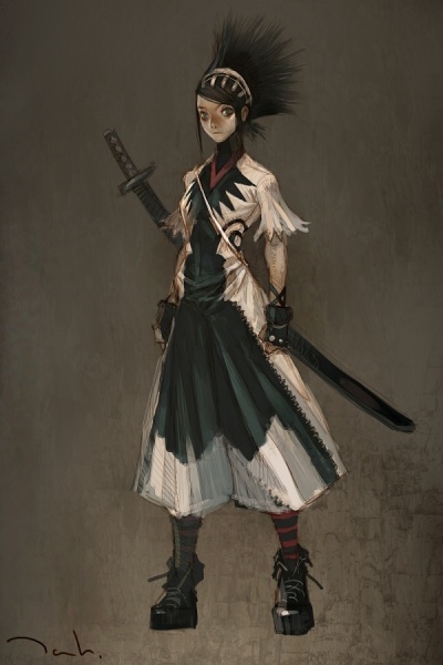 Siren is an undeniably diminutive figure, standing only slightly over five feet tall and weighing maybe 100 pounds; her wiry frame is at its best sinewy and at its worst gaunt. Though she is hardly ashamed of her wiry figure she also understands the need to present herself as more formidable in most circumstances, as a result Siren is almost never without her soulsteel breast plate worn under her heavy robes, the armor making her appear far more fullbodied. In the rare occasions she goes without her armor, and often even with it, she wears multiple layers of heavy robes adding pounds of cloth to her frame and hiding some of her perceived fragility. Her lithe body moves with feline grace and elegance with smooth and precise motions, though she often falls into periods of statue like stillness if not actively engaged. Due to the above average length of her reaper daiklave and her own short stature, she wears the long elegant blade across her back rather than the traditional location of wearing the curved blade on her hip. Siren's skin is porcelain smooth and pale white in contrast to her stark black, straight hair and cool grey eyes. Though it is difficult to tell with the immortal abyssal exalted, Siren appears no older than 18 years of age.